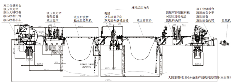 收紙機一雙工位儲料臺一上料小車一液壓放卷機一液壓托臂一接料引頭、鏟頭、二輥夾送+三輥整平、液壓料頭剪一覆膜一活套(前渡橋)一糾偏一壓料一縱剪一廢絲收卷一活套(后渡橋)一預分料、張力機一收卷一下料小車—液壓控制—電氣控制;